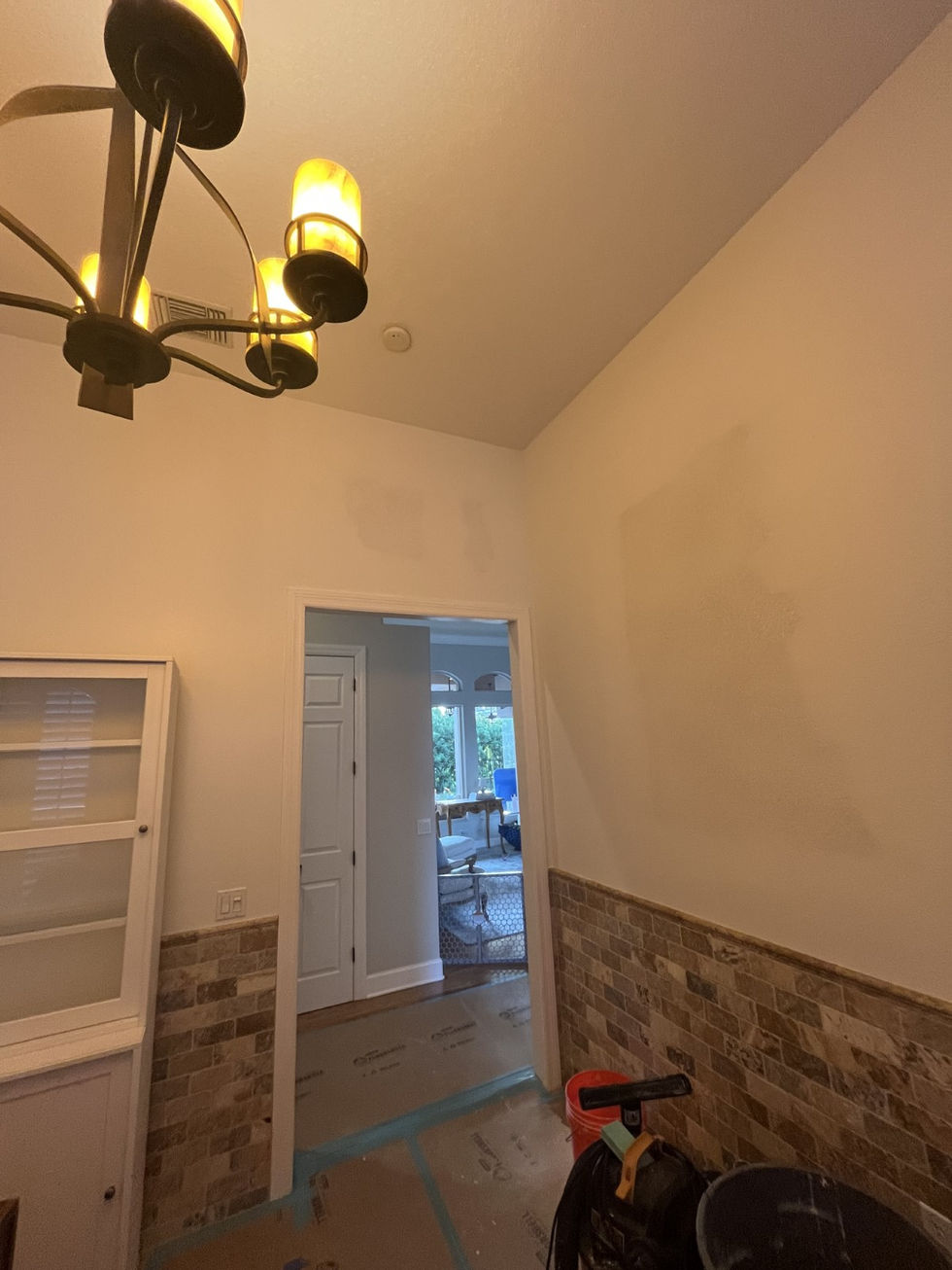This project showcases various rooms and spaces undergoing renovation, including the installation of framing, trim, and drywall, wainscoting, custom hood range. It also features the use of tools and protective coverings in the renovation process.
